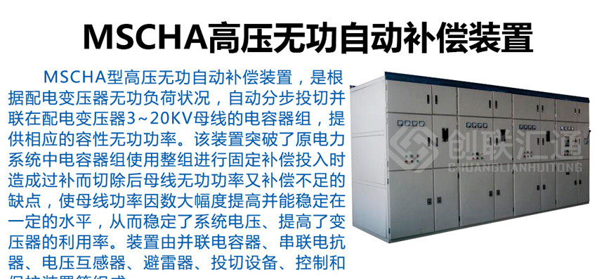 MSCHA型高壓無功自動補償裝置,是根據配電變壓器無功負荷狀況,自動分步投切并聯在配電變壓器3~20kV母線的電容器組,提供相應的容性無功功率。該裝置突破了原電力系統中電容器組使用整組進行固定補償投入時造成過補而切除后母線無功功率又補償不足的缺點,使母線功率因數大幅度提高并能穩定在一定的水平,從而穩定了系統電壓、提高了變壓器的利用率。裝置由并聯電容器、串聯電抗器、電壓互感器、避雷器、投切設備、控制和保護裝置等組成。