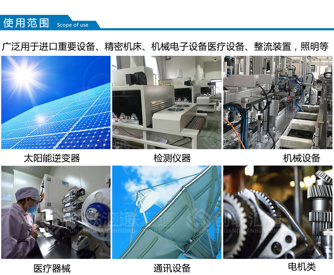 廣泛用于進口重要設(shè)備、機密機床、機械電子設(shè)備、醫(yī)療設(shè)備、整流裝置、照明等,安裝場所應無嚴重影響變壓器絕緣強度的氣體,蒸汽,化學性沉積,污垢,導電塵埃及無其他易爆易燃易腐蝕的物質(zhì)。