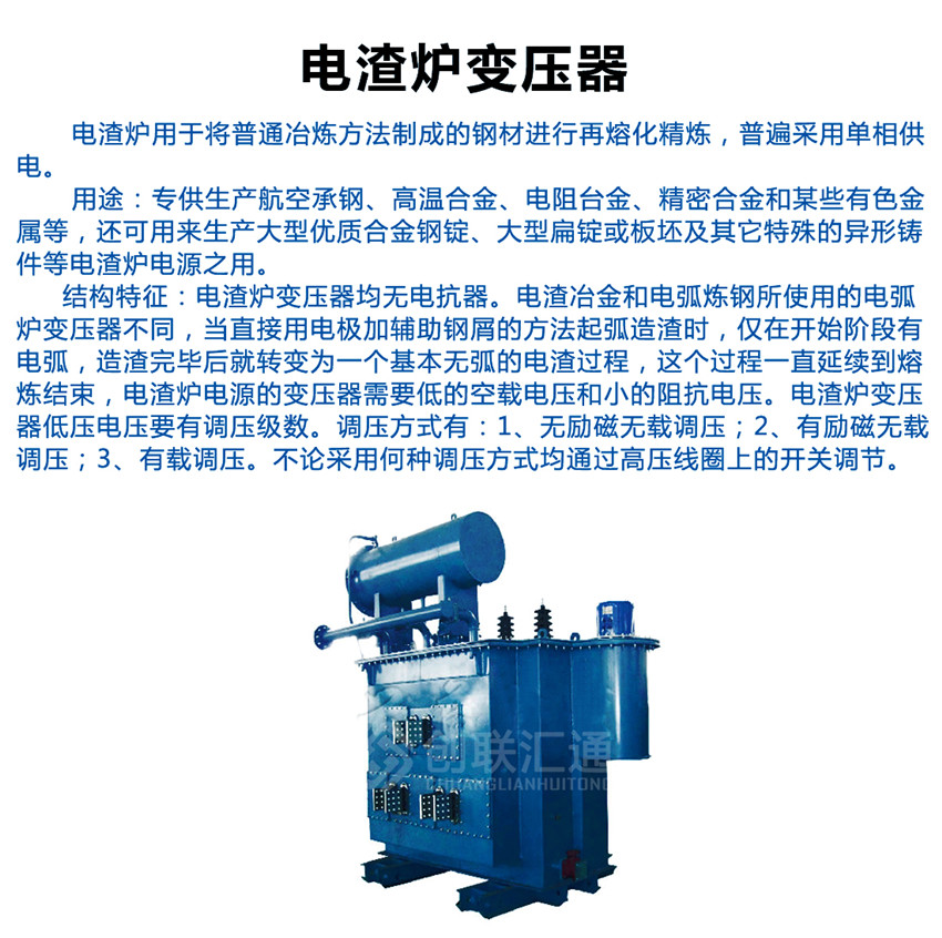 電渣爐變壓器電渣爐變壓器均無電抗器,專供生產航空承鋼、高溫合金、電阻臺金、精密合金和某些有色金屬等,還可用來生產大型優(yōu)質合金鋼錠、大型扁錠或板坯及其它特殊的異形鑄件等電渣爐電源之用。