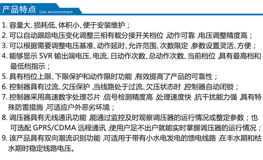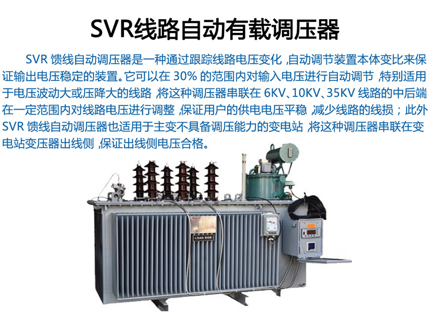 我公司生產(chǎn)的SVR型線路自動調(diào)壓變壓器原理是SVR與10kV 柱上無功自動補償裝置GWJ配合使用,可有效地解決線路電壓低及無功電源不足的問題。SVR 能有效地調(diào)節(jié)電路電壓, GWJ無功補償裝置能有效補償無功,提高功率因數(shù),降低線損,其效果相當于一個簡易的柱上變電站,而造價僅為常規(guī)變電站的1/6~1/10。而成本只有變電站的1/6,1/7,而且無需工作人員值班維護。