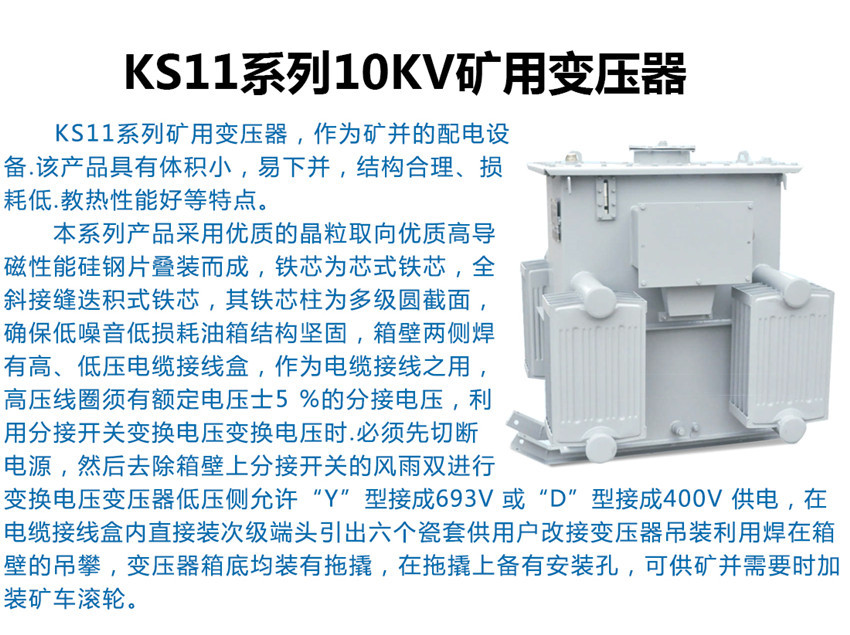 KS11變壓器適用于煤礦井下中央變電所、井底車場、總進(jìn)風(fēng)道和主要進(jìn)風(fēng)道,雖有瓦斯但無爆炸危險(xiǎn)的場所。也適用于隧道比較潮濕的環(huán)境中