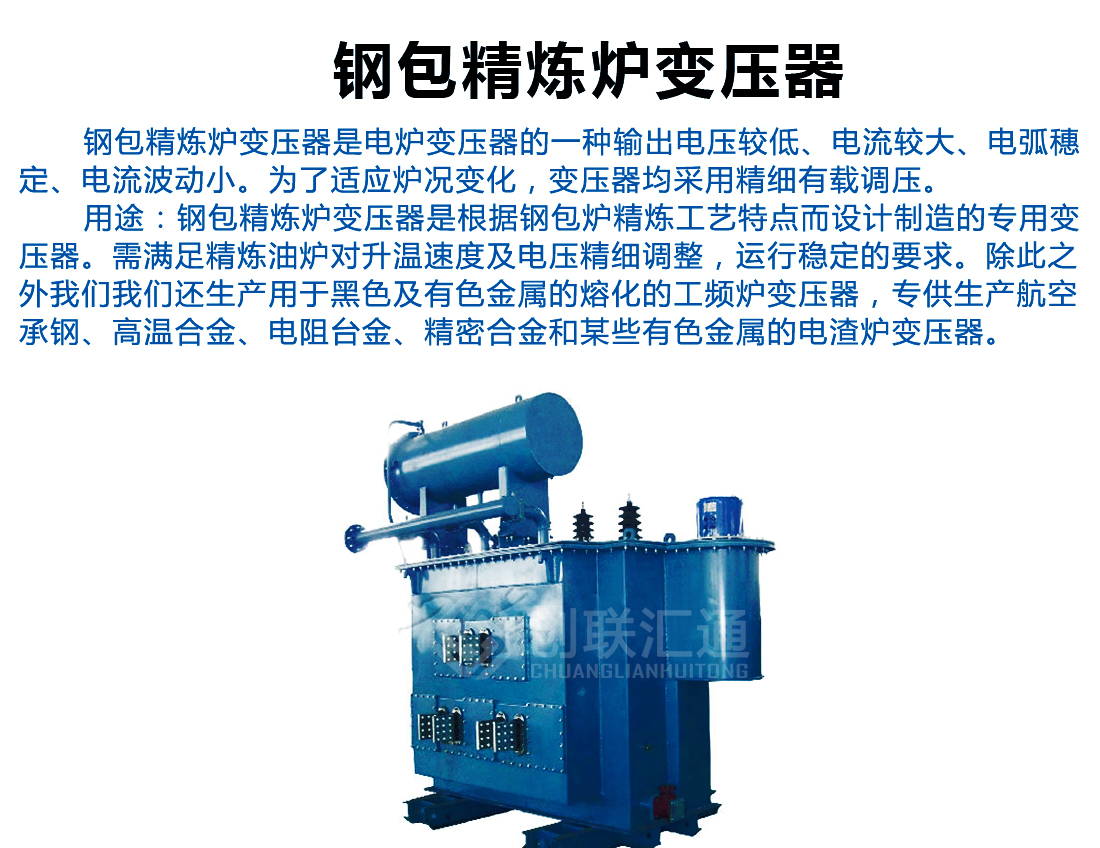 鋼包精煉爐變壓器是根據鋼包爐精煉工藝特點而設計制造的專用變壓器。需滿足精煉油爐對升溫速度及電壓精細調整,運行穩定的要求。除此之外創聯匯通電氣還生產用于黑色及有色金屬的熔化的工頻爐變壓器,專供生產航空承鋼、高溫合金、電阻臺金、精密合金和某些有色金屬的電渣爐變壓器。