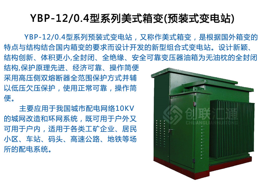 ●YBP-12/0.4型系列預裝式變電站,又稱作美式箱變,是根據外箱變的特點與結構結合內箱變的要求而設計開發的新型組合式變電站。